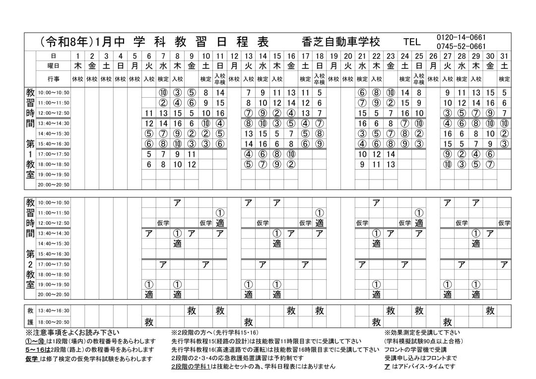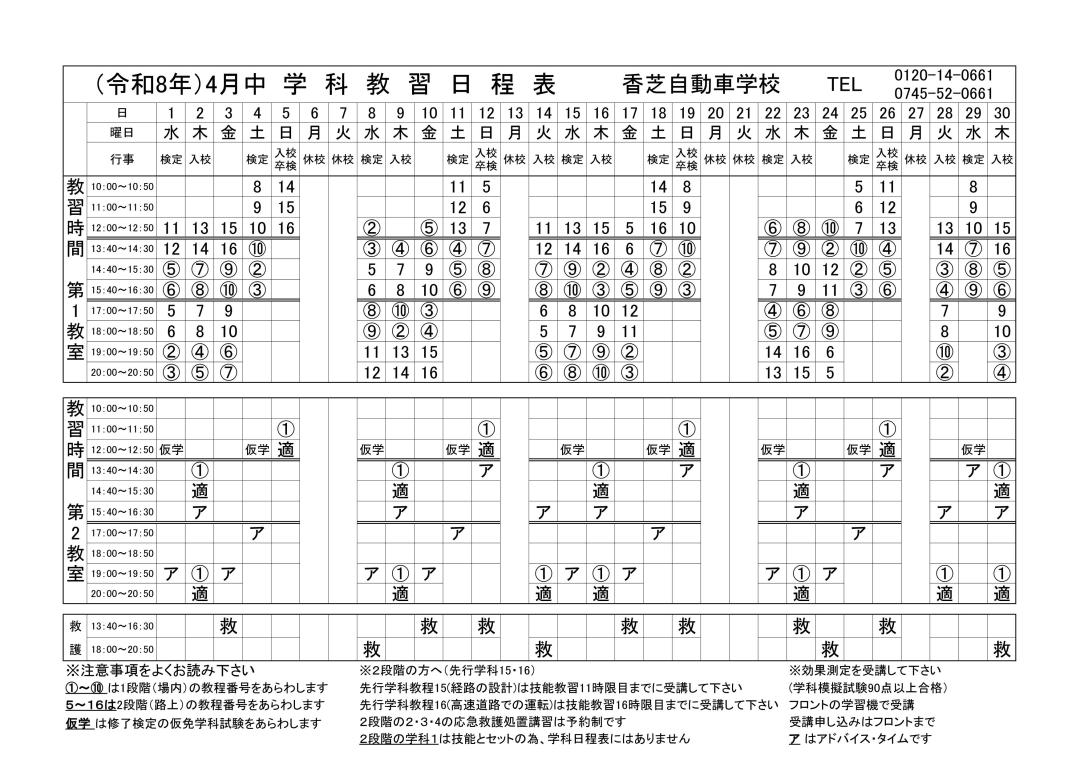 ・2段階の学科1は技能とセットの為、学科日程表にはありません。