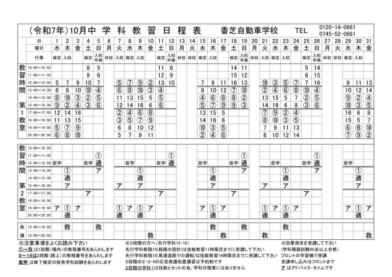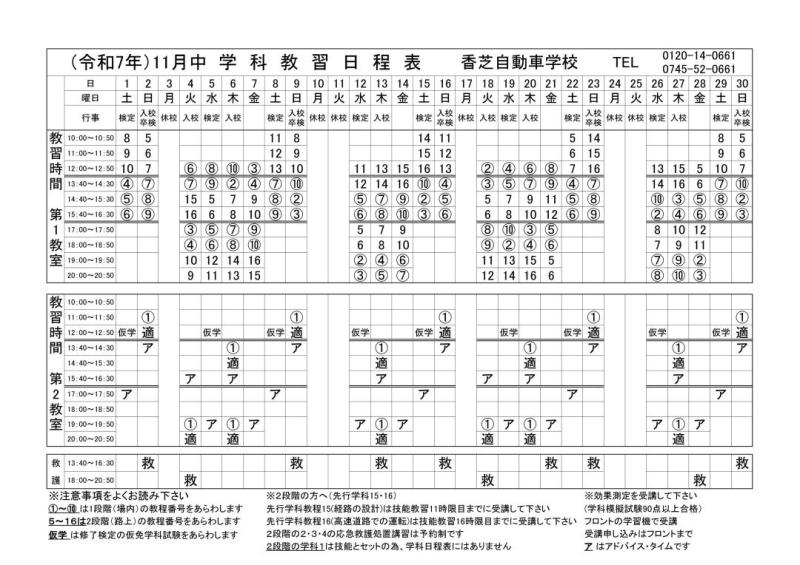 ・2段階の学科1は技能とセットの為、学科日程表にはありません。