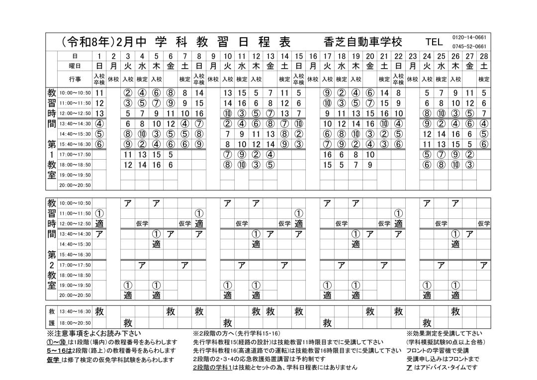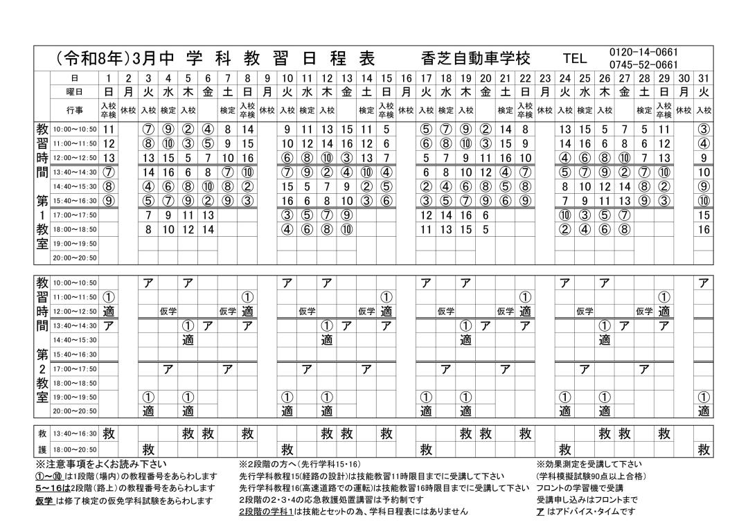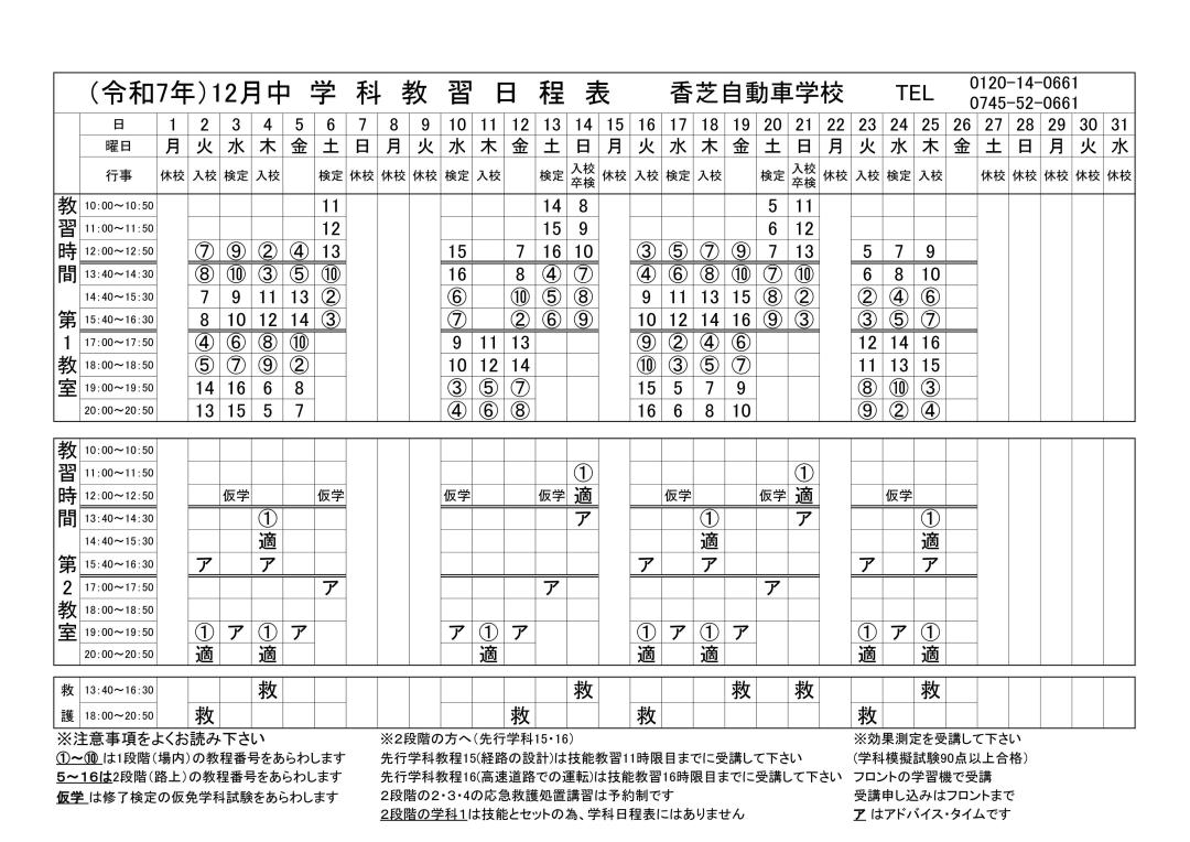 ・2段階の学科1は技能とセットの為、学科日程表にはありません。
